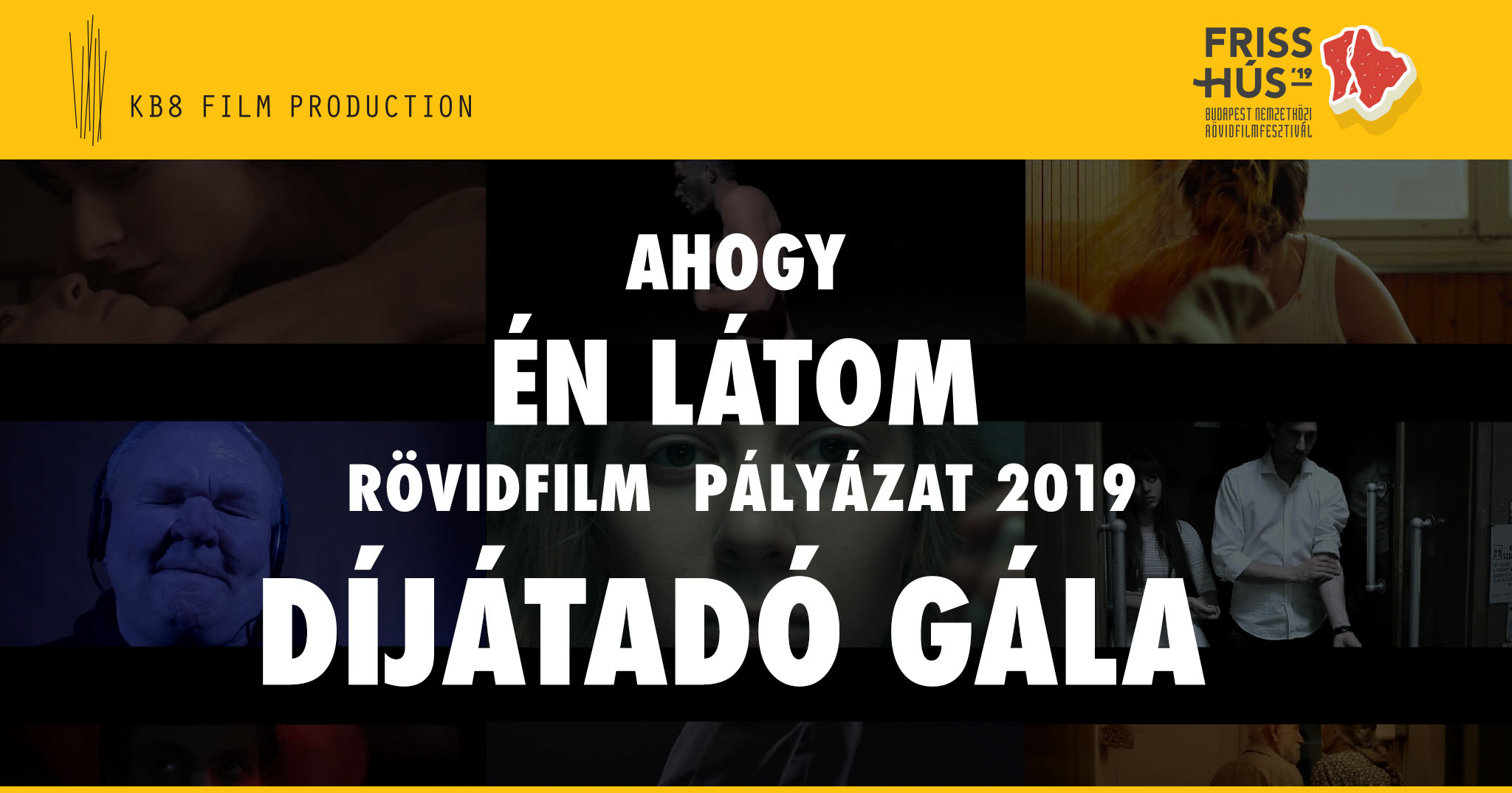 Immáron második alkalommal rendezi meg döntőjét és díjátadóját a KB8 Film Production “Ahogy én látom 2019 - Rövid történetek” címmel. Idén az együttműködésnek köszönhetően a 7. Friss Hús Rövidfilmfesztivál keretein belül egy külön blokkban kapnak helyet a pályázat döntősei, ahol nemcsak megnézzük a legjobb filmeket, hanem beszélgetünk róluk a szakmai zsűrivel.